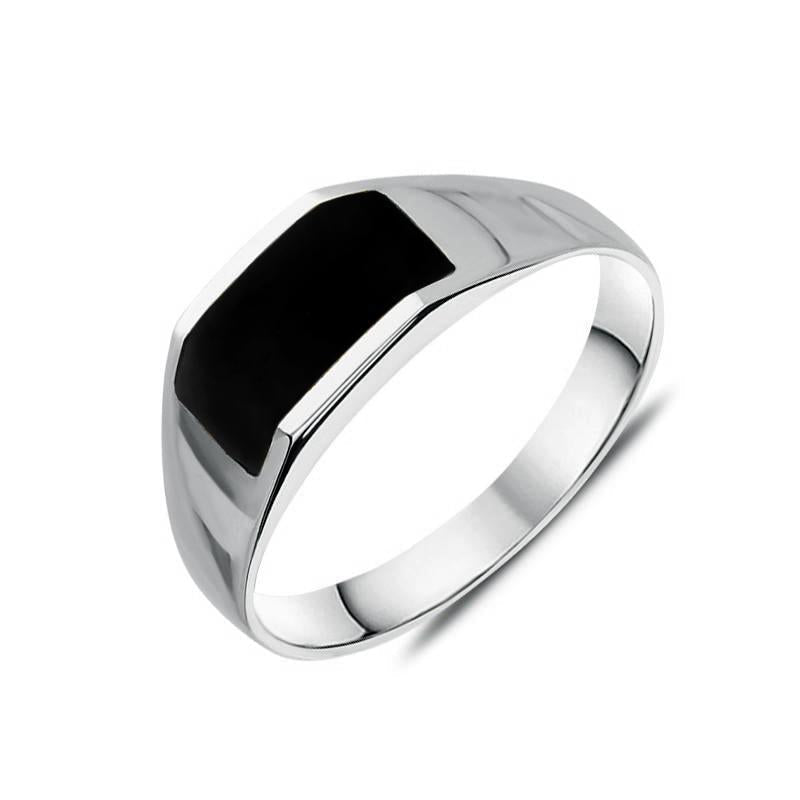 This angular oblong Whitby Jet ring gives a contemporary edge to the ancient gemstone. The sterling silver band cuts off at the stone setting, holding the Whitby Jet at an offset angle.