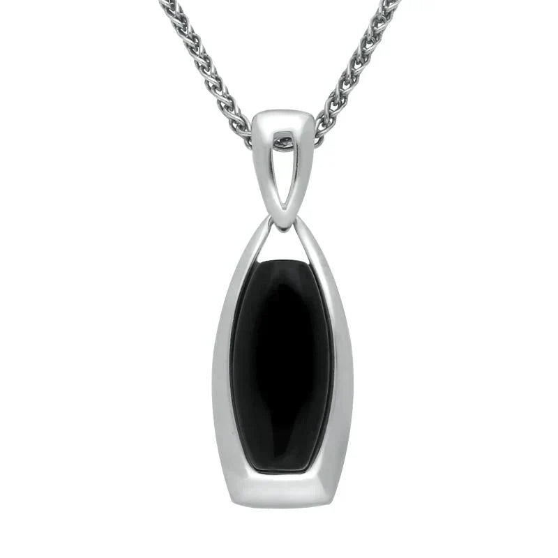 This contemporary pendant features a curved barrel shaped hand carved Whitby Jet gemstone that is set within a curved sterling silver frame which hangs gently from an elegant open silver bail. Complete with an 18 inch sterling silver chain.