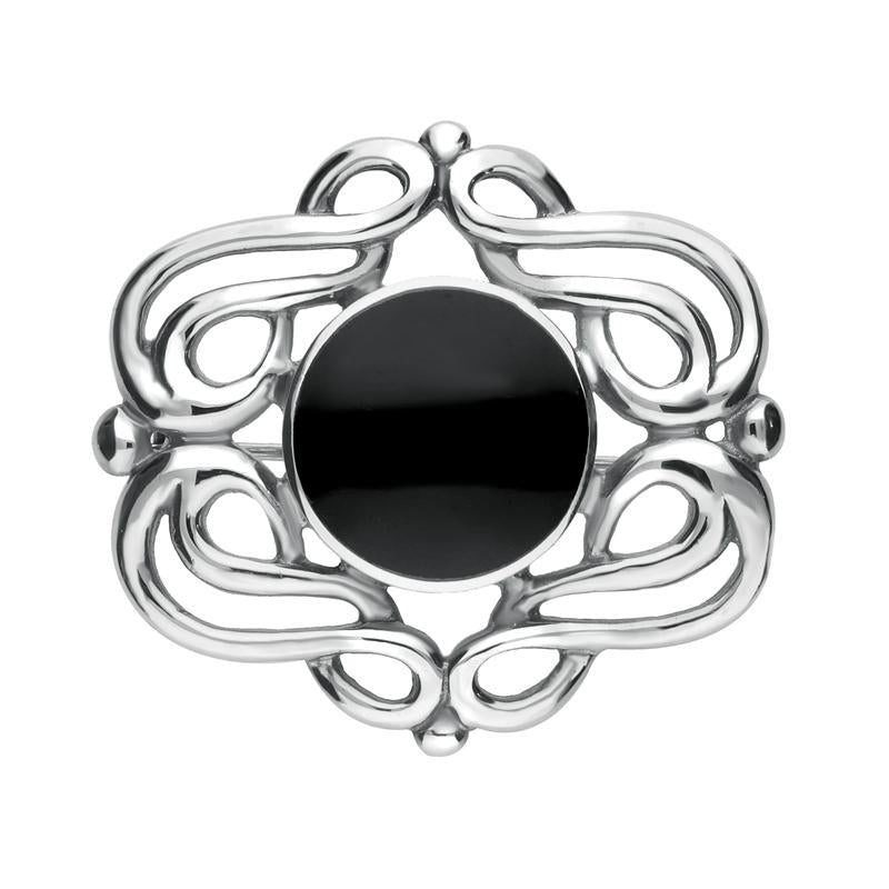 Sterling Silver Whitby Jet Round Fancy Swirl Brooch