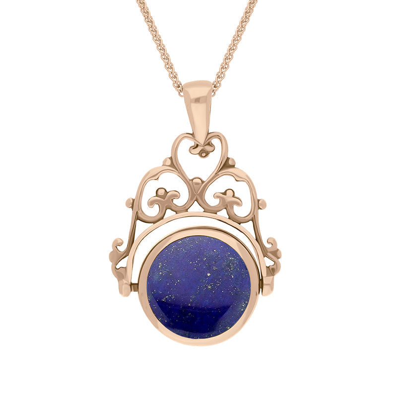 18ct Rose Gold Whitby Jet Lapis Lazuli Double Sided Round Swivel Fob Necklace