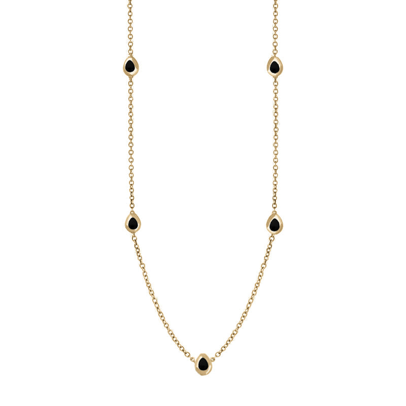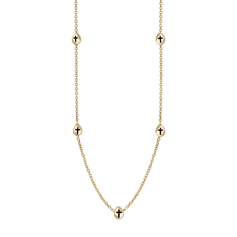This on trend 18ct yellow gold chain necklace features petite discs embellished with cross shaped fine Whitby Jet stones that have been sourced directly from the North East coast of Yorkshire.