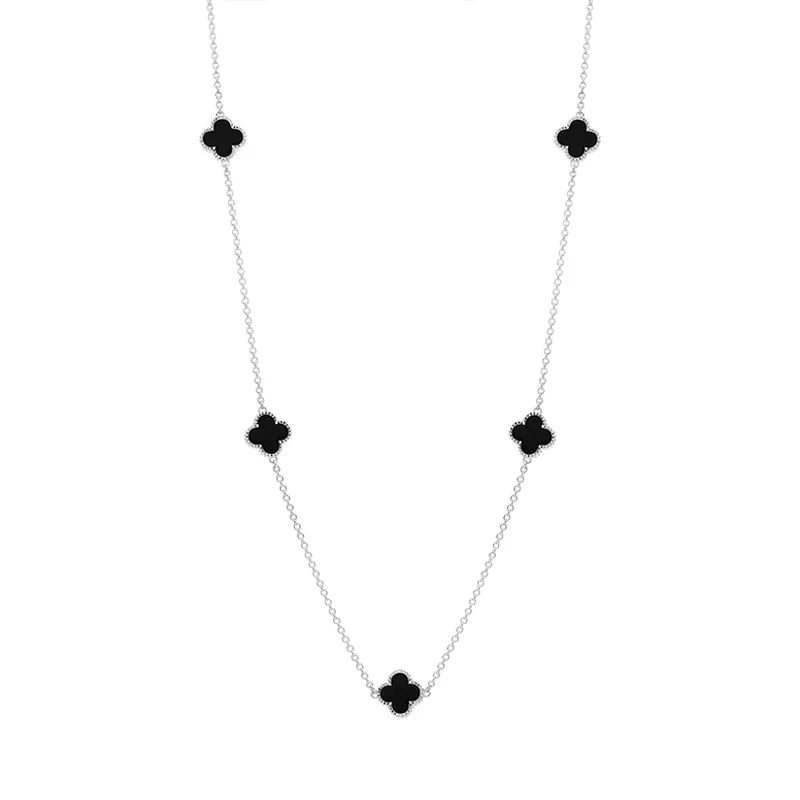 9ct White Gold Whitby Jet Bloom Four Leaf Clover Ball Edge Necklace