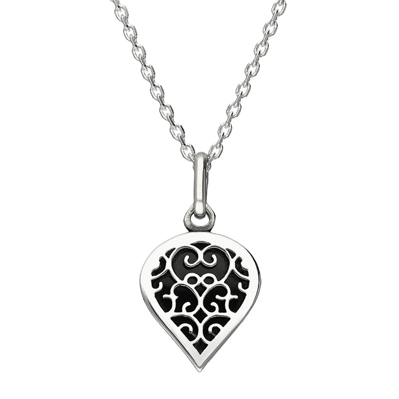 9ct White Gold Whitby Jet Flore Filigree Small Heart Necklace. P3629.