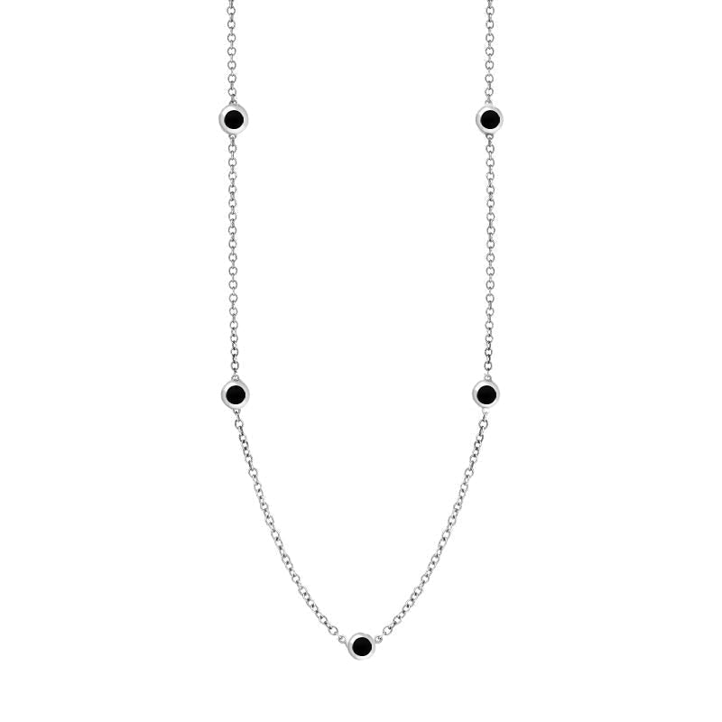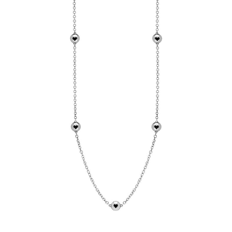 This on trend 9ct white gold chain necklace features petite discs embellished with heart shaped fine Whitby Jet stones that have been sourced directly from the North East coast of Yorkshire.