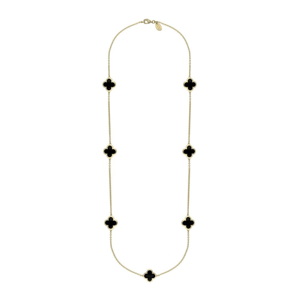 9ct Yellow Gold Whitby Jet Bloom Four Leaf Clover Long Necklace