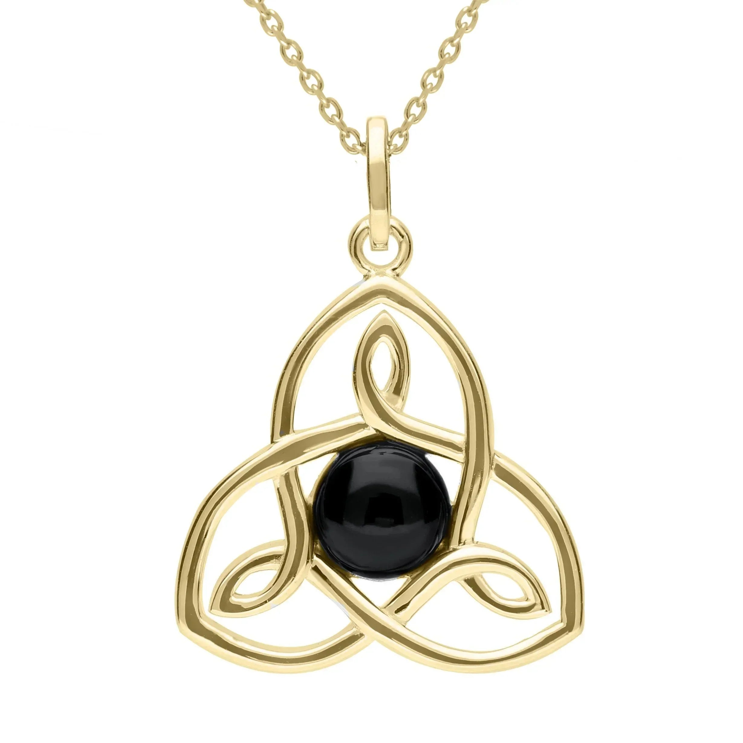 This unique necklace features a central Whitby Jet gemstone, sourced directly from the North East coastline of Yorkshire. The hand carved round Jet stone is enclosed by an intricate Celtic knot design, finely handcrafted in 9ct yellow gold. Sold complete with an 18 inch 9ct yellow gold chain with a classic bolt ring style clasp, this rare British gemstone set necklace is perfectly designed for everyday wear.