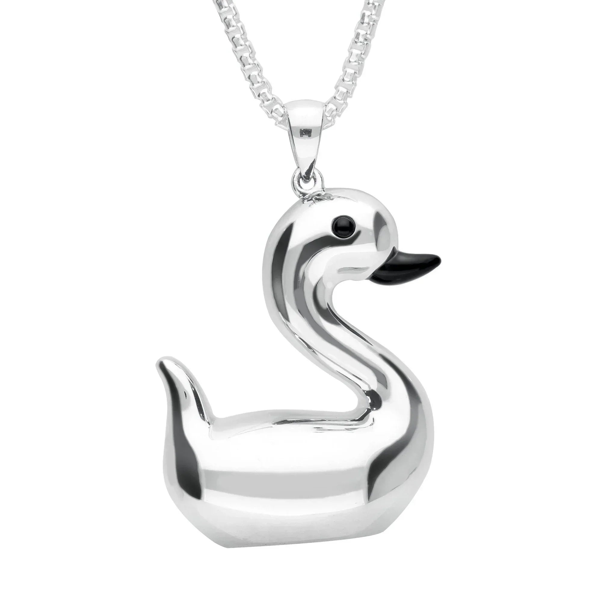 This unique necklace features stunning Whitby Jet gemstones, sourced directly from the North East coast of Yorkshire, which are set into the beak and eye of the sterling silver duck design. The pendant hangs gracefully from a fluid 30 inch sterling silver chain complete with a classic bolt ring clasp for easy wear.