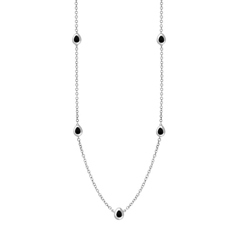 This on trend 18ct white gold chain necklace features petite discs embellished with cross shaped fine Whitby Jet stones that have been sourced directly from the North East coast of Yorkshire.