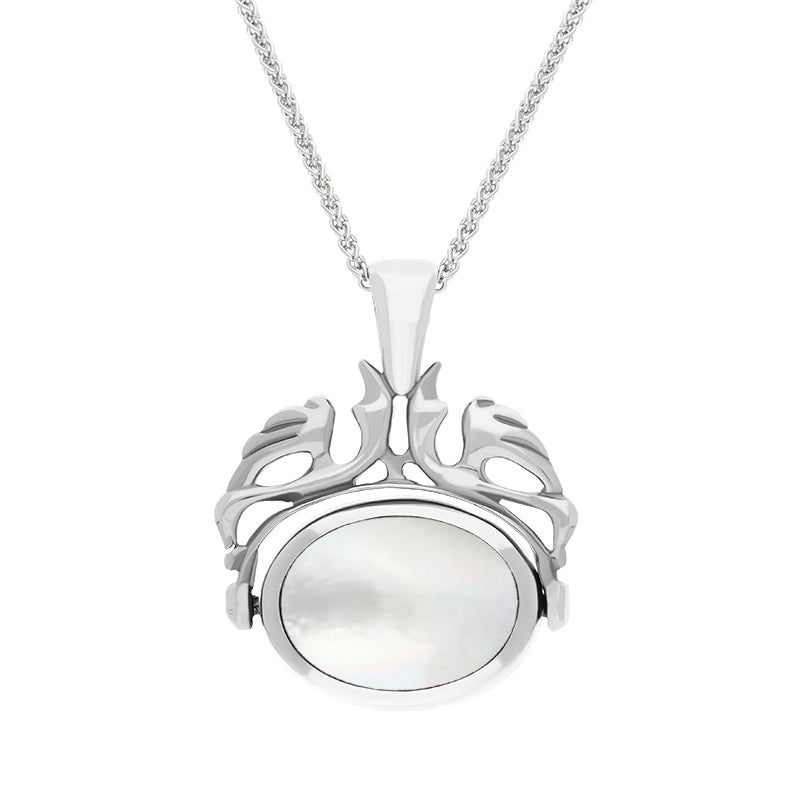 9ct White Gold Whitby Jet Mother Of Pearl Double Sided Oval Swivel Fob Necklace, P104_4.