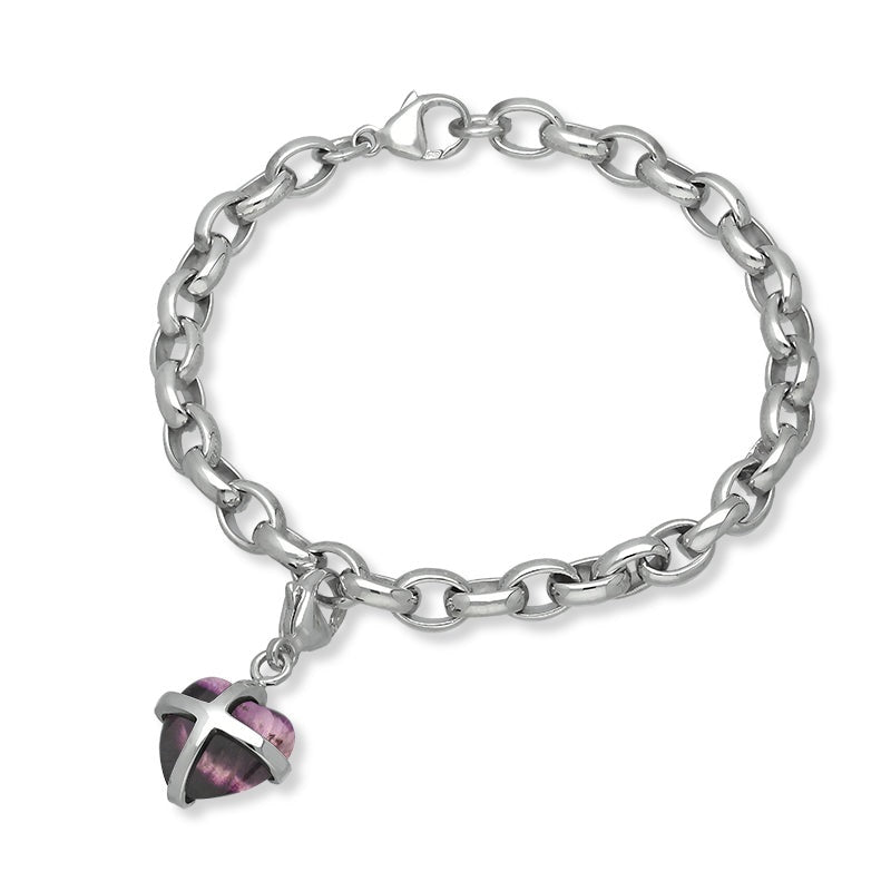 A signature design by Robert & Victoria, this elegant bracelet is part of our Cross Hearts collection. The bracelet features a hand carved heart shaped Blue John gemstone, sourced directly from Castleton in Derbyshire. The individual highly polished gemstone has been framed within a 9ct White gold mount that embraces the stone in a cross design. A secure lobster clasp and solid 9ct White gold chain completes the bracelet.