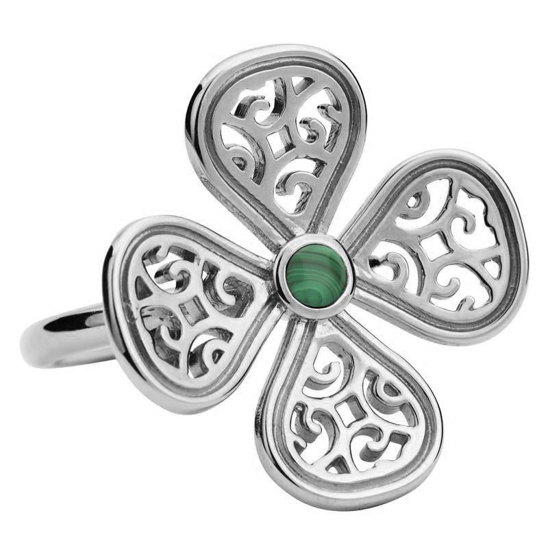 9ct White Gold Malachite Flore Four Petal Filigree Ring