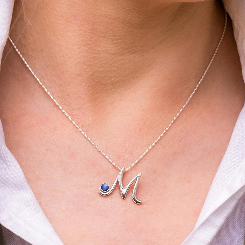 From the new 'Love Letters' collection designed and handcrafted in our very own workshop, this 9ct yellow gold necklace features an initial 'M' with a circular Moonstone. The pendant and stone hang elegantly from a 18 inch 9ct yellow gold chain.