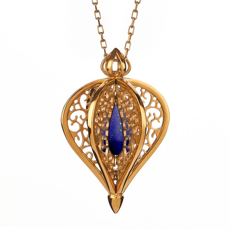 This beautiful necklace is part of Rebecca Sellors' Flore collection. The pendant is formed of yellow gold plated sterling silver petals with intricate filigree detailing. In the centre is a hand carved and polished Lapis Lazuli. The pendant hangs gracefully from a yellow gold plated sterling silver chain which fastens with a classic bolt ring style clasp.