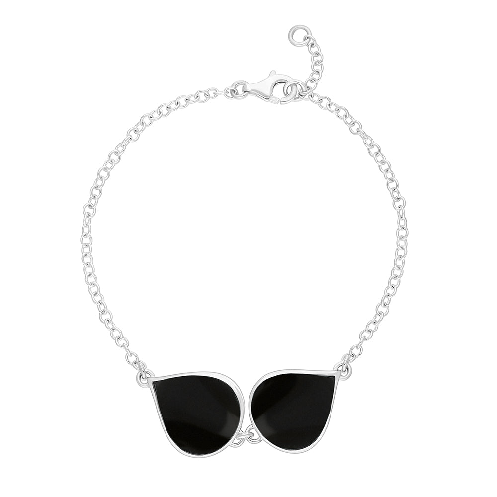This bracelet is part of Rebecca Sellors' Flore collection, featuring two beautifully crafted teardrop-shaped cabochons of the finest Whitby Jet stone which has been sourced locally from the Whitby coastline, North Yorkshire. Encased within an intricate sterling silver filigree design, this piece is complete with a classic chain which fastens with a lobster clasp, ensuring a secure and comfortable fit.