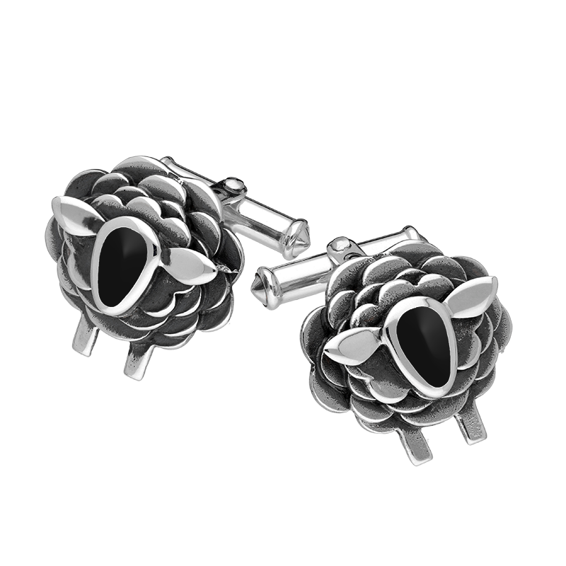 These simple cufflinks feature a beautiful sheep design, where a stunning piece of Whitby Jet completes the sheep face on each sterling silver cufflink.