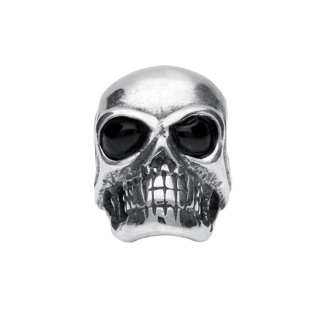 This sinister charm is handcrafted into a chilling skull design as part of our Gothic collection. The haunting sterling silver skull features two circular cabochons of the finest Whitby Jet stone, sourced directly from the north coast of Yorkshire to create soulless eyes. The statement charm is inspired by many Gothic events held in Whitby throughout the year.