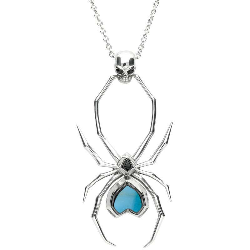 Sterling Silver Whitby Jet Turquoise Gothic Spider Skull Necklace, P2038.